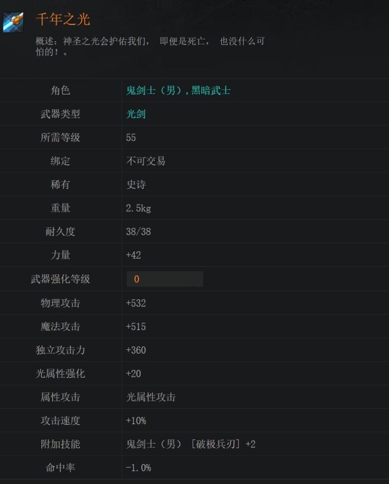 地下城勇气(夜语黑瞳太刀)属性:技能攻击力增加40附加属性强化伤害